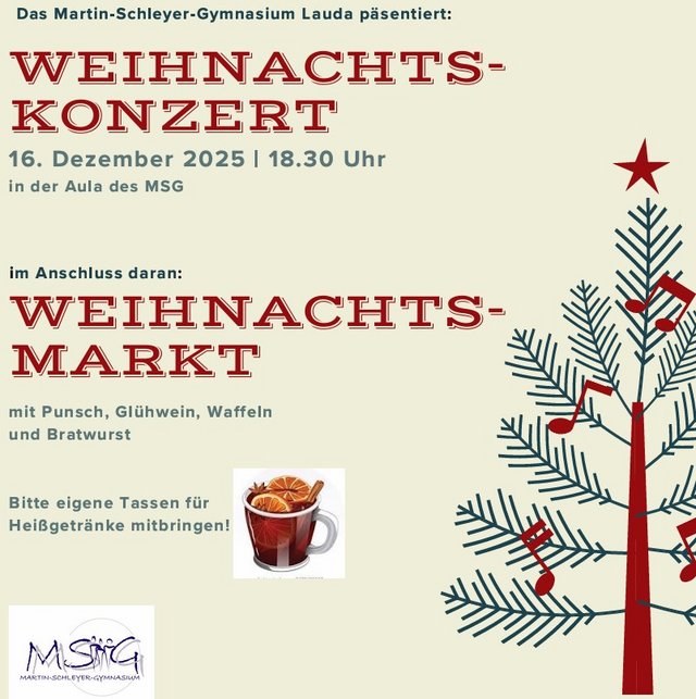 Am Dienstag, den 16. Dezember 2025, findet um 18:30 Uhr unser großes Weihnachtskonzert in der Aula mit anschließendem Weihnachtsmarkt statt.
