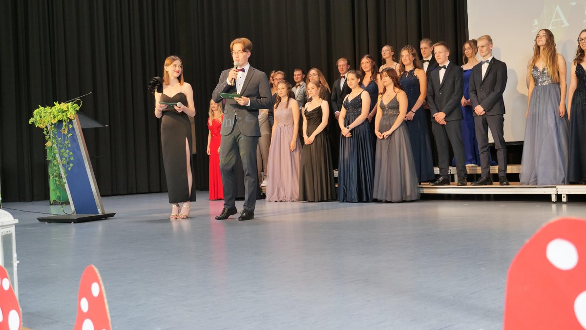 Der Abitur-Jahrgang 2023 des Martin-Schleyer-Gymnasiums Lauda hatte sich mit „Once Abi A Time“ ein märchenhaftes Abimotto ausgesucht, passend zu dem guten Ende der großen, gerade auch schulischen Einschränkungen durch Corona und dem für alle guten Ende der Schullaufbahn. Märchenhaft geschmückt wie ein Zauberwald war auch die Festhalle. In sie zogen die AbiturientInnen, 45 Königinnen und Könige festlich gewandet ein, um ihren Schatz, das Abiturzeugnis, in Empfang zu nehmen. Die einem Märchen nachempfundene Moderation des Abends übernahmen souverän die beiden Schülersprecher Anna Pineker und Philipp Christ.