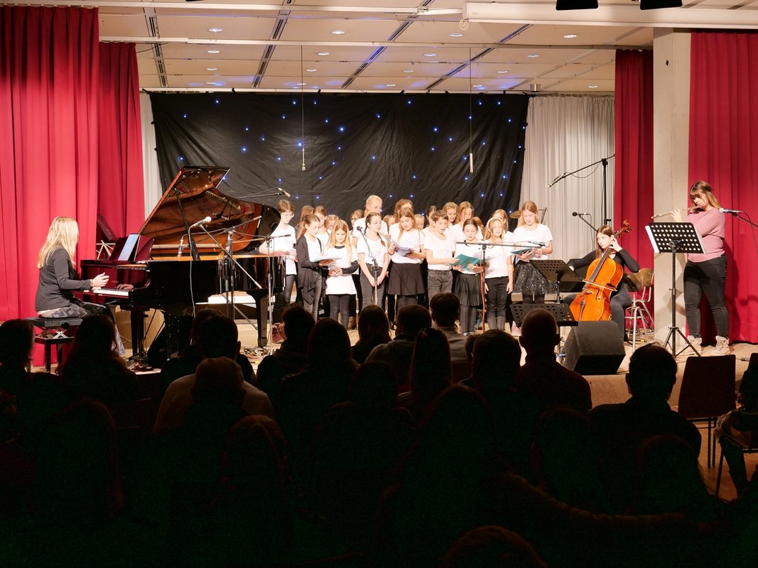 Vom grauen Winterblues wollte der Mittel- und Oberstufenchor die Gedanken des Publikums hinweg tragen. Sie präsentierten das poetische Lied „Winter Branches“ – zusammen mit Kira Kneis am Chello – sowie „O holy night“, ein ursprünglich französisches Weihnachtslied aus dem 19. Jahrhundert.