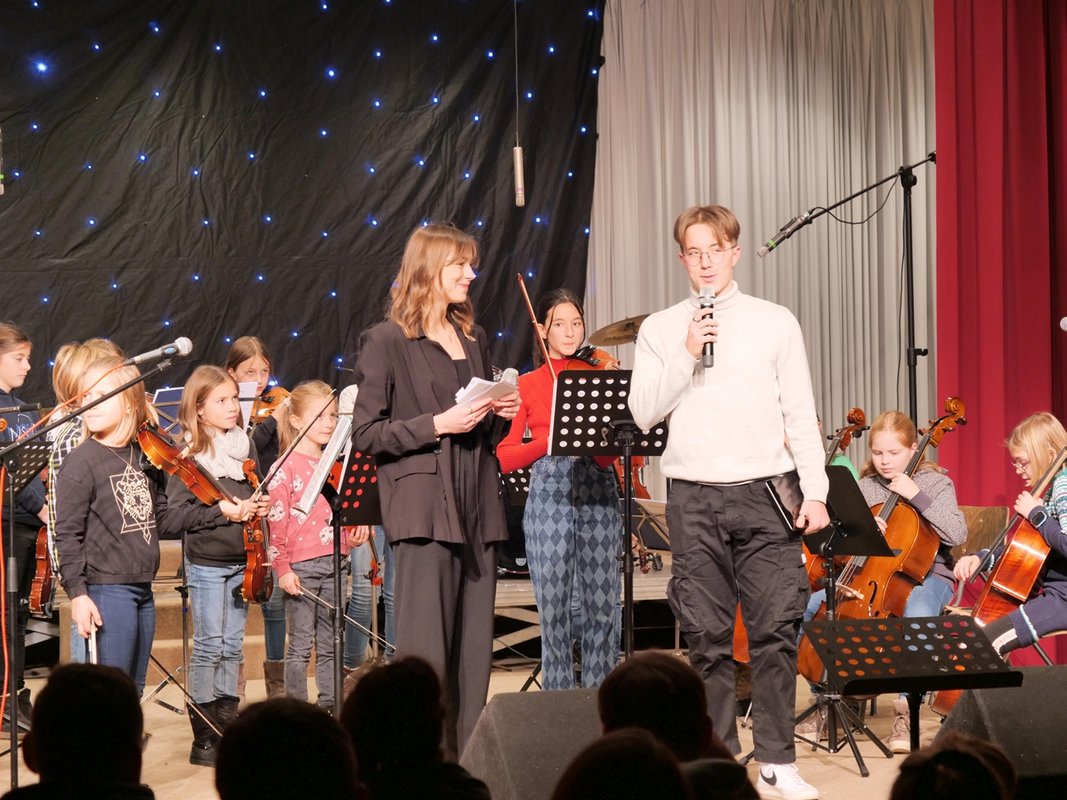 Nach der Begrüßung durch die Schülersprecher Anna Pineker und Philipp Christ, die überdies souverän und mitunter auch humorvoll durch das Programm führten, stimmte die Streicherklasse auf das Konzert ein. Mit der Unterstützung des Vororchesters der Musikschule präsentierten die Schülerinnen und Schüler der Klasse 5, die erst seit Schuljahresbeginn ihr Streichinstrument lernen, die traditionellen Weihnachtslieder „Alle Jahre wieder“ und „Oh, du fröhliche“.