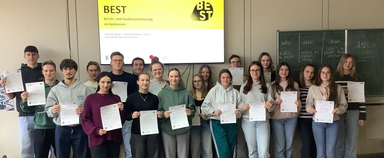 Im Rahmen des einwöchigen BEST-Trainings (Berufs- und Studienorientierung) hatten die Schülerinnen und Schüler der Jahrgangsstufe am MSG die Gelegenheit, sich intensiv mit ihren eigenen Interessen, Fähigkeiten und Wertvorstellungen auseinanderzusetzen. Ziel des Seminars war es, auf dieser Grundlage passende Studiengänge oder berufliche Perspektiven zu entwickeln und die eigene Entscheidungskompetenz nachhaltig zu stärken.