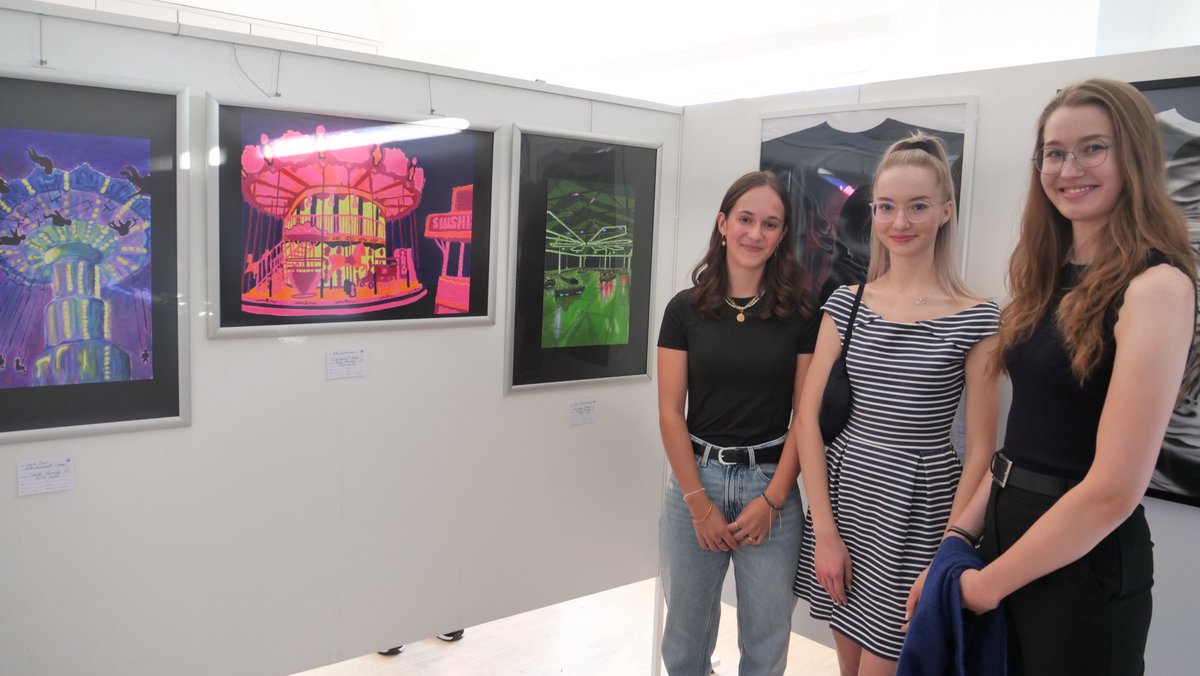 Hierbei haben es unsere Schülerinnen Luise Bier, Lena Pfreundschuh und Nika Zimmermann geschafft, mit ihren leuchtenden Rummelplatzimpressionen zu überzeugen und mit ausstellen zu dürfen. Die im Oberstufenkunstunterricht des Martin-Schleyer-Gymnasiums von Stephi Baumann entstandenen Malereien sind Teil der Schwerpunktthemas „Abbild und Idee in Stillleben und Landschaft“. Hierbei soll die bei allen Schülern sehr beliebte Messe in verschiedenen Szenen das leuchtende Nachtleben zeigen, in dem die Fahrgeschäfte und Buden eine ganz eigene Landschaft bilden und sich vom dunklen Nachthimmel abheben. Im kreativen Prozess entstand auch die Idee, diese zeitgleich zur Messe auszustellen. Carmen Coupé vom Kunstkreis nahm diese freudig auf und eröffnete uns sogar noch eine weitere Ausstellungsfläche in der Galerie das Auge in Lauda, also eine zweite Kunstausstellung.