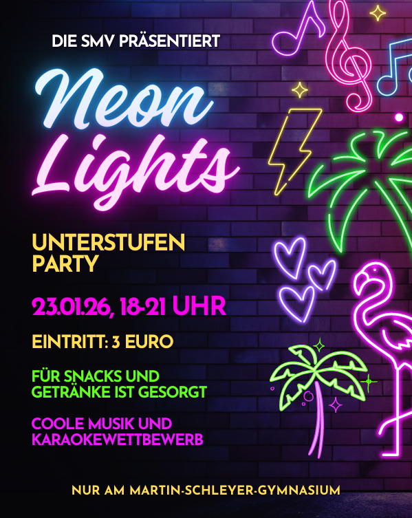 Am 23. Januar 2026 findet die nächste Unterstufenparty mit dem Motto "NEON-LIGHTS" am Martin-Schleyer-Gymnasium statt.
